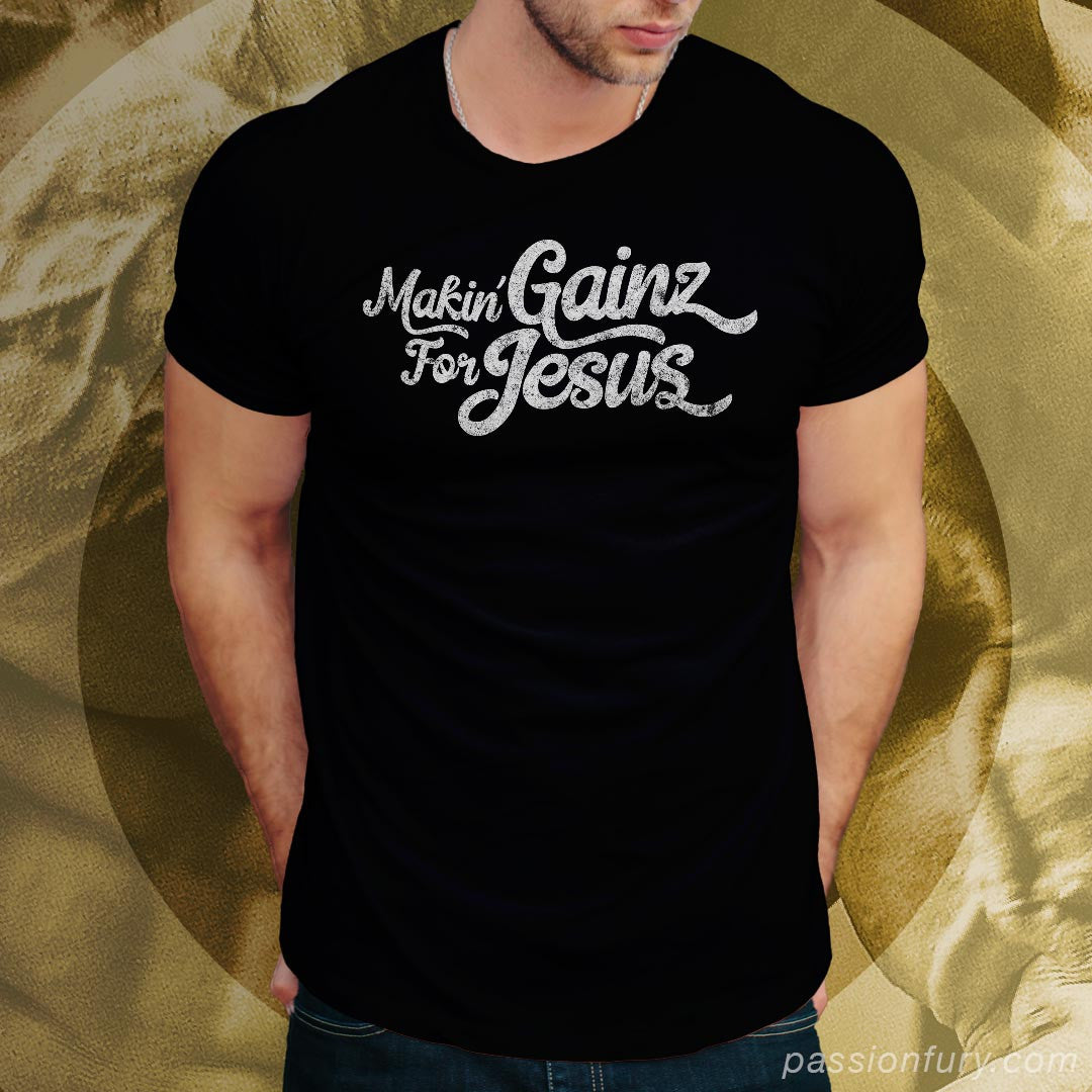 Are You a Christian who works out at the gym? Show your Faith in a striking way with this original and stylized Christian Tee Shirt. It reads "Making' Gainz for Jesus", and it's been designed so you can share you're love for Jesus...even when you work-out!