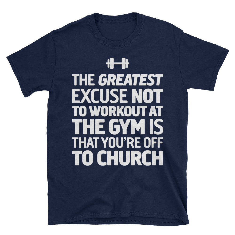 The T-Shirt reads: "The Greatest Excuse Not to Workout at the Gym is that You're off to Church". The design is totally unique, and wearing this design is a fantastic way to share your Faith in a very humorous manner.