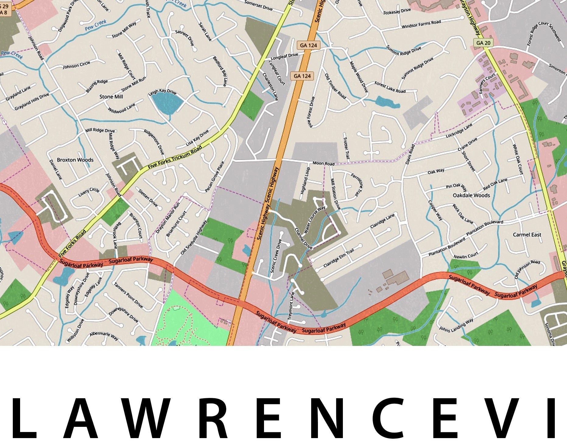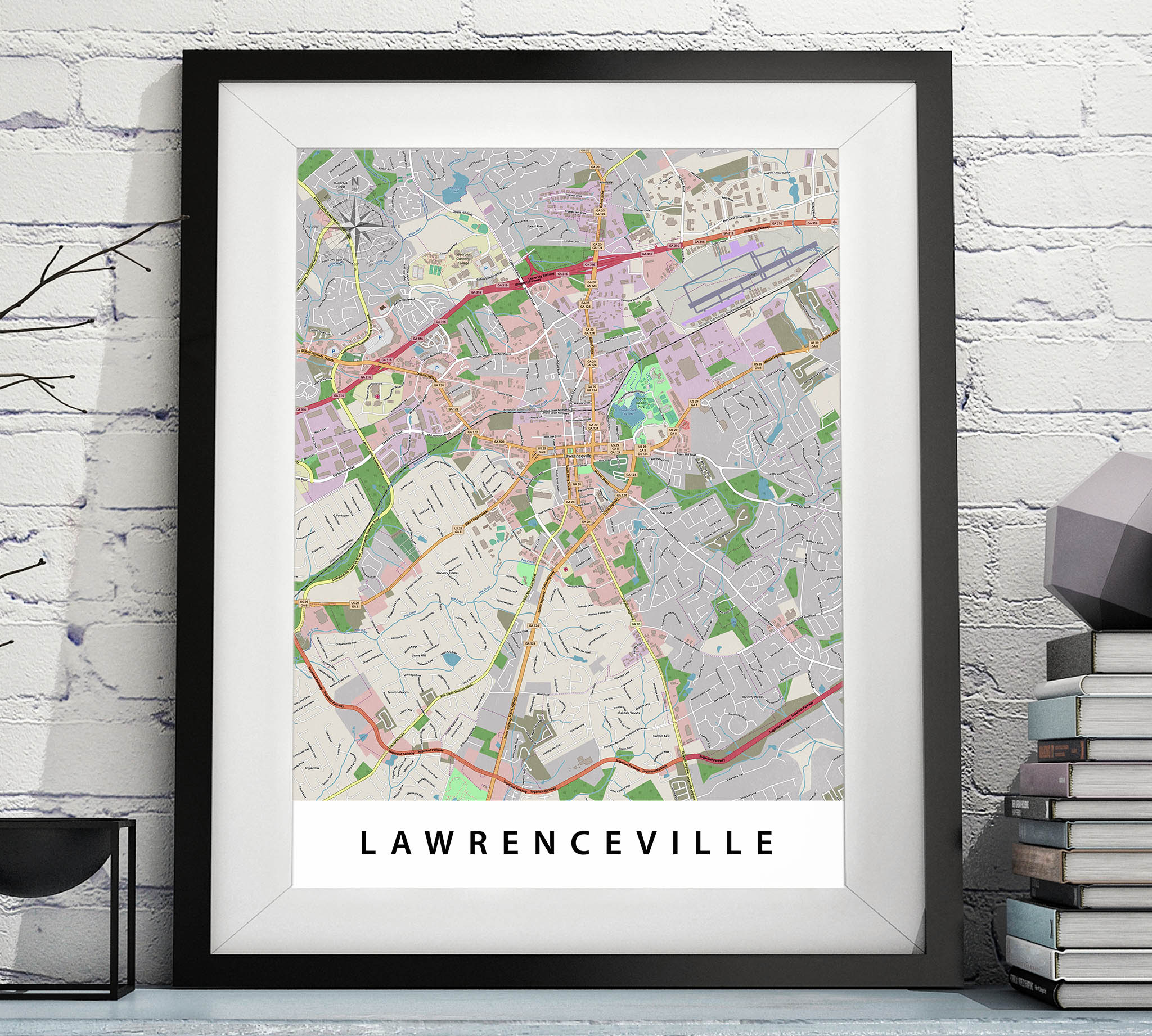This modern, contemporary printable Lawrenceville GA Map shows wonderful town in great detail. As can be seen in the images, the text has a slightly-textured effect. Simply Print, Frame & Display - even on the same day.