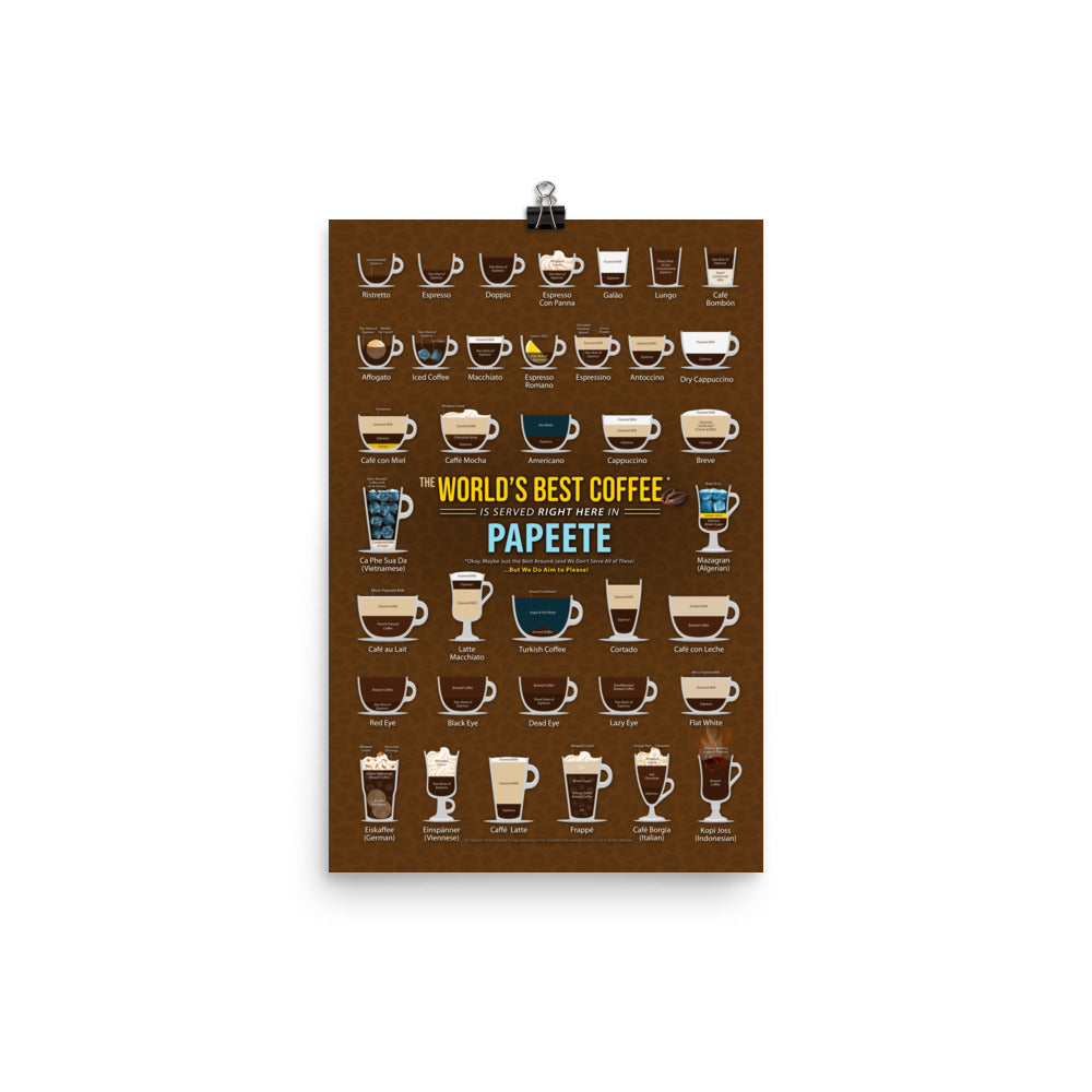UNIQUE TYPES OF COFFEE CHART for Coffee Shops or Home Kitchens in Papeete, French Polynesia, France - The Phases 'World's Best Coffee' with a Humorous Disclaimer Stating 'Okay, Maybe Just the Best Around (and We Don't Serve All of These) ...But We Do Aim to Please'; Along with City Name. Brown, Beige, White, Yellow and Blue Vintage & Minimalistic Design Shows Coffee Varieties and Flavors Complete with Coffee Beans, Names, Ingredients & Amounts. It Shows the Ratios of How Much Steamed, Scalded, Foamed or Micro-foamed Milk Is in Each Variety; with the Coffee to Water Ratio for French Press & Coffee Machines. PERFECT CONVERSATION PIECE OF ART - This Ingenious and Elegant Coffee Guide Design Shows the Coffee Varieties of Many Caffeinated Drinks from Across the World - Talk over a Hot Cup of Drip, Brewed or Filter Coffee; Perfect For Coffee House Workers, Friends, Family, Barista, Owner or Manager of Coffee Shops, Diner or Cafeteria. #REFCOFF83857